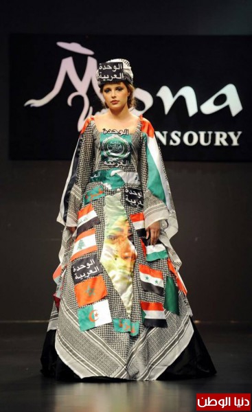 في إطلالة جديدة من إطلالات مصممة الأزياء العالمية مني المنصوري دعتمن خلالها الدول العربية إلي التوحد من خلال فستان يحمل إعلام الدولالعربية كإشارة منها إلي ضرورة التوحدلمواجهة الإخطار التي تحدق بالدول العربية ومنطقة الشرق الأوسط وتقول المنصوري أن تصميم هذا الفستان من حوالي 7 أعوام دعت فيه أعضاء الجامعة العربية للتوحد ضدالإخطار التي تواجه الدول العربية ونبذ الفرقة والالتفاف حول هدف واحد هو الاتحادقوةقالت منى المنصوري، إنها نجحت في الرسائل التي اعتادت توجيهها فيالعروض التي تقدمها في تغيير الصورة التي كانت سائدة عن مصممي الأزياء، وانفصالهم عنواقع المجتمعات التي يعيشون فيها، ، وتقديم رسائل ذات مضامين مختلفة في العروض التي يقدمونهاوهذا ما تحقق الآن من توحد الدول العربية والوقوف صفا واحد في مواجهه الإرهاب والإخطار التي تهدد امن وسلامةالدول العربية وقالت خير دليل ما شهدناة من الوقوف بجانب مصر مواجهه الإرهابوالدعم العربي للاقتصاد المصري بالإضافةإلي تعاون الدول العربية في عاصفة الحزم.