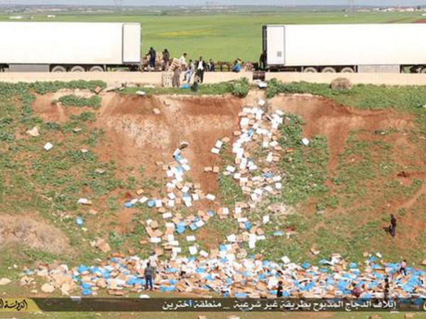 بث تنظيم "داعش"، فيديو جديدًا لمحرقة كبيرة لكراتين من الدجاج المجمد، بدعوى أن هذا الدجاج تم قتله فى أمريكا، وليس حلالًا، (أي لم يذبح على الطريقة الإسلامية).