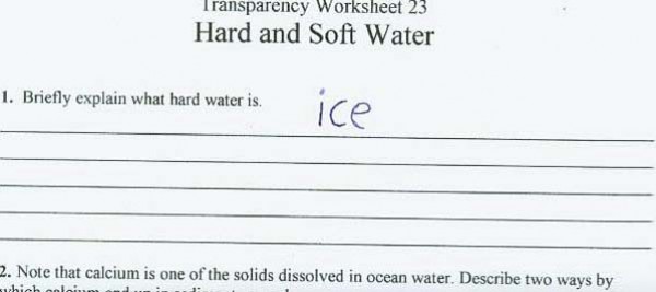 8. في سؤال يتطلب وضع وصف لمدى قوة أو قسوة الماء، كانت إجابة الطالب «الثلج»، وهي إجابة منطقية نوعًا ما لكنها لم تستثير عطف المصحح.