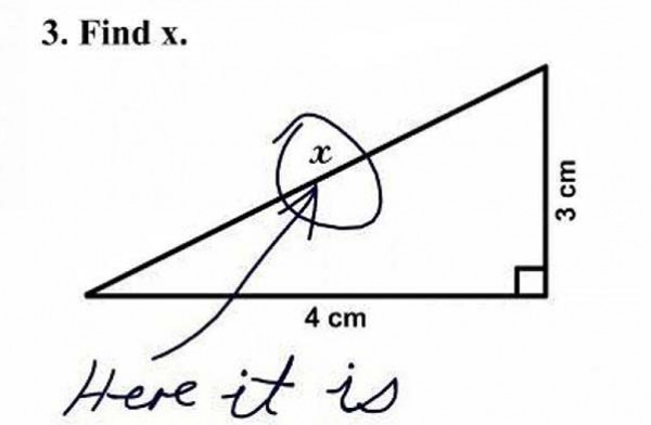 6. سؤال هندسي يطلب إيجاد قيمة الضلع X في هذا المثلث لكن صيغة السؤال جاءت «أوجد X»، فأجاب الطالب العفوي بأن رسم سهمًا يشير إلى الضلع، ظنًا منه أن المصحح أضاعه ويبحث عنه.