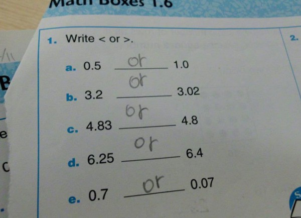 1. سؤال يقوم ضع علامة أكبر من أو أقل من، لكن طريقة كتابة السؤال جعلت معناه كأنما يقوم ضع كلمة «أو – or»، وأن العلامات على جانبيها ما هي إلا تنصيص، فقام الطالب بما فهمه من تلك الصياغة ووضع or في كل النقاط.