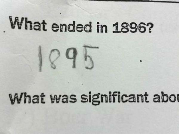 4. سؤال في التاريخ يطلب من الطالب أن يحدد ما انتهى عنده عام 1896، فأجاب بأنه العام 1895.