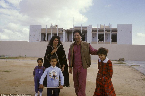 “معمر القذافي” وزوجته وأولاده قرب قصر “باب العزيزية” في نوفمبر 1986، والذي استهدفته الولايات المتحدة بغاراتها، كما تبدو في الخلفية آثار تلك الغارات.