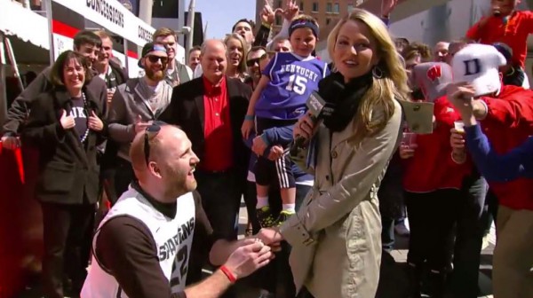 وكانت الصحفية الأمريكية "آلي لافورس" تغطي مباراة جمعت بين فريقي مشيجان ستايت ودوك بالدوري الجامعي لكرة السلة الأمريكية، عندما تفاجأت بأحد المشجعين يتقدم نحوها ويجثو على قدميه طالبا يدها.