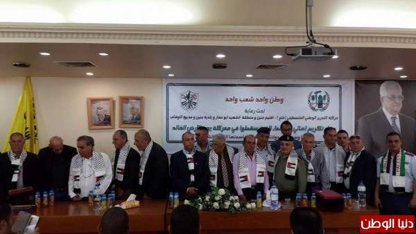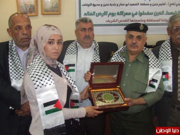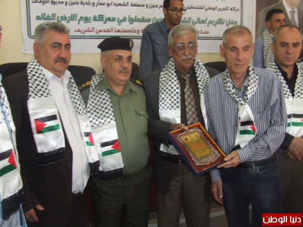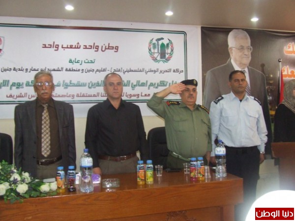 تحت رعاية حركة التحرير الوطني الفلسطيني فتح-إقليم جنين، وبلدية جنين ومديرة الأوقاف ، شارك قائد منطقة جنين وطوباس العقيد كن محمد ابو هيفاء ومجموعة من الضباط وصف ضباط قوات الأمن الوطني الفلسطيني في حفل تكريم أهالي الشهداء الذين سقطوا في سخنين وعرابة البطوف ونور شمس.