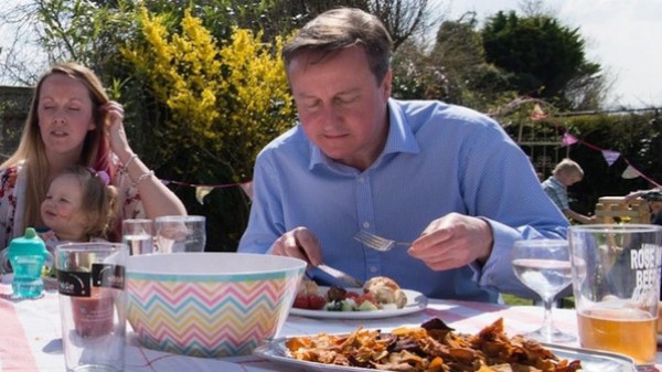 وكان الهدف من مشاركة رئيس الحزب المحافظ البريطاني في حفلة شواء انتخابية إعطاء صورة لكاميرون على أنه رجل عادي قريب من الناس، وتجلى ذلك خصوصاً من خلال استغنائه عن البزة الرسمية وربطة العنق.