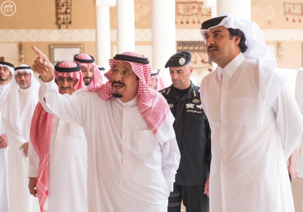 استقبل خادم الحرمين الشريفين الملك سلمان بن عبدالعزيز في قصر العوجا بالدرعية اليوم، أمير قطر الشيخ تميم بن حمد آل ثاني والوفد المرافق له.