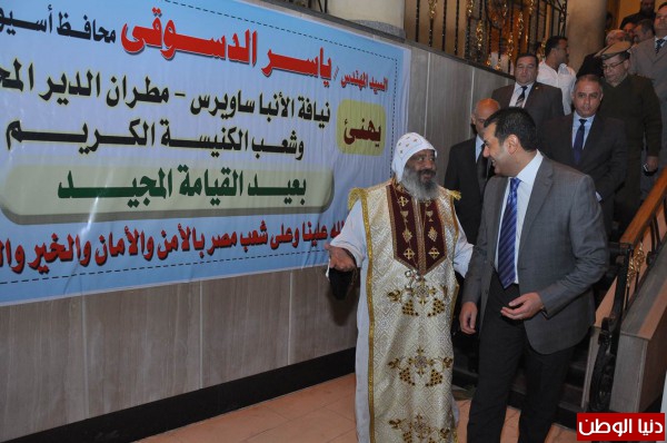 وكان محافظ اسيوط قد زار مساء امس عشية الاحتفال بعيد القيامة المجيد مطرانية منفلوط وقدم التهاني لنيافه الأنبا أنطونيوس مطران منفلوط وأهالي منفلوط ثم توجه لمطرانية ديروط وهنأ نيافة الأنبا برسوم مطران ديروط كما حضر القداس الذي أقيم بالدير المحرق بالقوصية وهنأ الأنبا ساويرس أسقف الدير المحرق وتوجه إلي مطرانية القوصية وقدم التهنئة إلى نيافة الأنبا توماس مطران القوصية.فيما عبر رجال الدين المسيحي عن سعادتهم بمشاركه المحافظ والقيادات الأمنية والتنفيذية وإخوانهم من رجال الدين الإسلامي هذه المناسبة السعيدة.