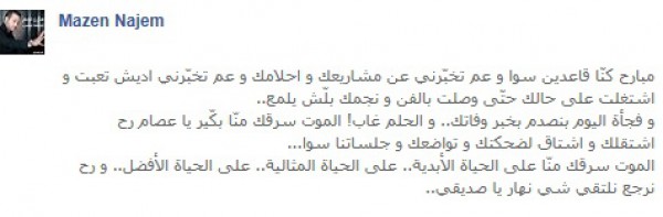 "مبارح كنّا قاعدين سوا و عم تخبّرني عن مشاريعك و احلامك و عم تخبّرني اديش تعبت و اشتغلت على حالك حتّى وصلت بالفن و نجمك بلّش يلمع.. و فجأة اليوم بنصدم بخبر وفاتك.. و الحلم غاب! الموت سرقك منّا بكّير يا عصام رح اشتقلك و اشتاق لضحكتك و تواضعك و جلساتنا سوا... الموت سرقك منّا على الحياة الأبدية.. على الحياة المثالية.. على الحياة الأفضل.. و رح نرجع نلتقي شي نهار يا صديقي.."