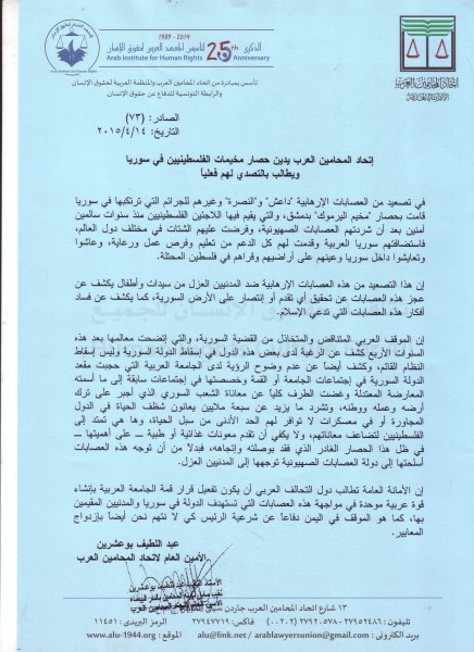 إتحاد المحامين العرب يدين حصار مخيمات الفلسطينيين في سوريا ويطالب بالتصدي لهم فعلياً