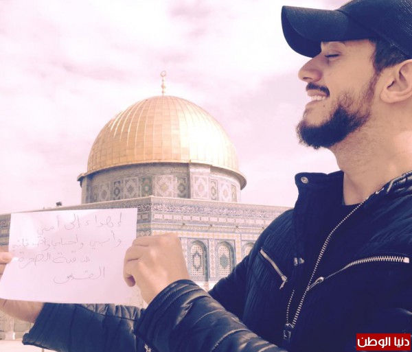 من ناحية أخرى، نشر المجرد صورته من مدينة القدس التي حل بها اليوم الجمعة، هذه الصورة التي تظهره وهو على مشارف الحرم القدسي أولى القبلتين وثالث الحرمين كتب لمجرد ورقة يقول فيها "إهداء إلى أمي وأبي وأحبابي وأصدقائي من قبة الصخرة القدس"
