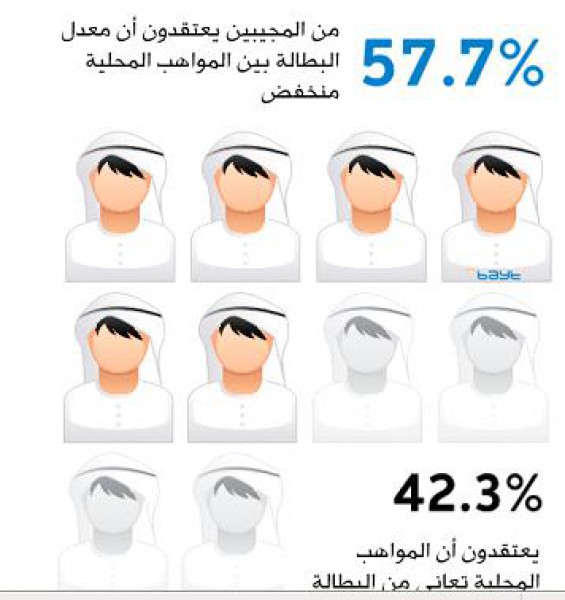 كما صرّح غالبية المجيبين (64,78%) بأن معدلات البطالة بين المواهب المحلية منخفضة في الإمارات، في حين يعتقد 35,22% منهم أنها مرتفعة. ويرى حوالي نصف المجيبين أن عملية البحث عن المواهب المحلية وتوظيفها سهلة للغاية، في حين يعتقد اثنان من أصل عشرة مجيبين أنها عملية صعبة للغاية.