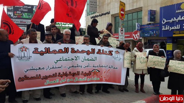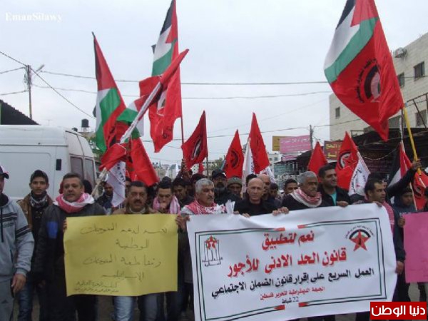 ووشددت كتلة الوحدة العمالية وانطلاقا من حق عمالنا بالعيش الكريم في مجتمع تسوده قيم العدالة الاجتماعية والمساواة، ندعو وزارة العمل الفلسطينية الى ضرورة تكثيف سياسة التفتيش لتطبيق قانون العمل الفلسطيني والحد الادنى للاجور وتحفيز الاقتصاد الوطني عبر دعم المنتجات الوطنية وخفض الضرائب عليها لتعزيز قدرتها على المنافسة، كي تسهم في زيادة نسبة التشغيل والحد من البطالة، ودعم القطاع الزراعي لتعزيز صمود المزارعين باراضيهم والتي تشكل جوهر الصراع مع الاحتلال. كما ندعو لضرورة استكمال سلة التشريعات باقرار قانون ضمان اجتماعي شامل يكفل المساواة ويضمن استقرار المجتمع الفلسطيني عبر العدالة والتوزيع العادل للدخول بما يشمل البطالة واصابات العمل والامومة والتقاعد كحد ادنى.