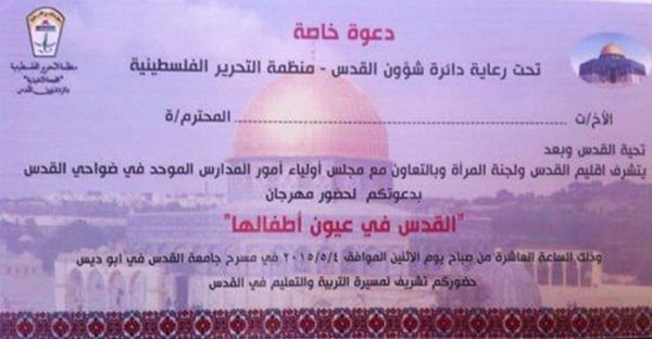تحت رعاية دائرة شؤون القدس - منظمة التحرير الفلسطينية من المقرر أن تنظم يوم الاثنين المقبل الساعه العاشرة صباحاً مهرجان كبير للاطفال بعنوان (القدس في عيون اطفالها ) على مسرح جامعة القدس ابو ديس .