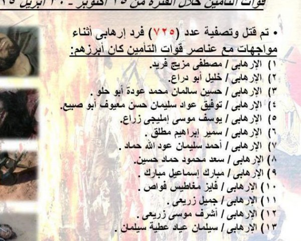 ونشر المتحدث باسم الجيش العميد محمد سمير نتائج أعمال القوات المسلحة المصرية في شمال سيناء منذ 25 أكتوبر 2014 حتى 30 أبريل 2015، موضحا أنها "أسفرت عن مقتل 725 عنصرًا إرهابيًا أثناء مواجهات مع القوات كان أبرزهم مصطفى مزيج فريد، وخليل أبو دراع، وحسين سالمان، وتوفيق عواد".
