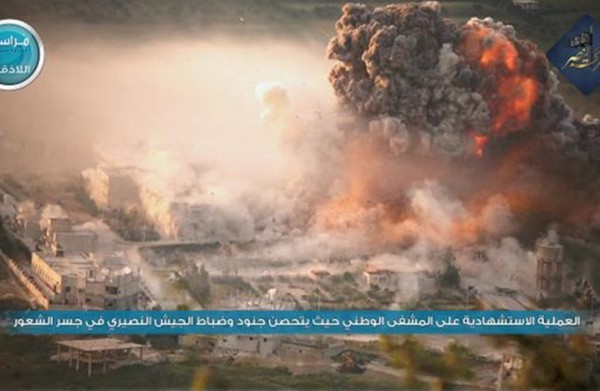 وأفادت التنسيقيات الإعلامية التابعة للمعارضة وأبرزها "شبكة شام"، في بيانات أصدرتها صباح اليوم الأحد، بأن "جيش الفتح" (تابع للمعارضة) نفذ "عملية استشهادية" استهدفت مشفى جسر الشغور بريف إدلب الذي يتحصن فيه قادة وعناصر من قوات النظام.