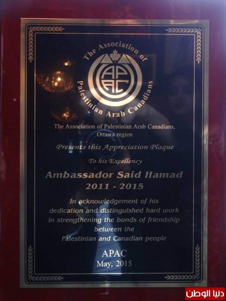في مساء الأمس قامت الجالية الفلسطينية بعمل حفل وداع للسفير حمد بوجود جمع غفير من أبنائها وعدد من الإعلامييين والرسمييين الكندين والمرشحين للإنتخابات.