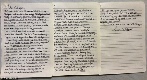 ونشرت لورين ويجنز، البالغة من العمر17 عامًا صورة للفستان، الذي تسبب في فصلها عبر صفحتها الشخصية على موقع التواصل الاجتماعي “فيس بوك” وأعربت عن غضبها من التمييز العنصري والجسدي ضد النساء.