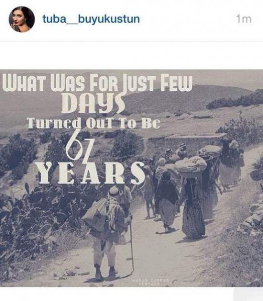 في ذكرى محزنة للشعب العربي أجمع تضامنت النجمة التركية توبا بويوكستين مع الشعب الفلسطيني في يوم الحزن الأسود الذي دام لمدة 67 عاماَ حتى يومنا هذا.