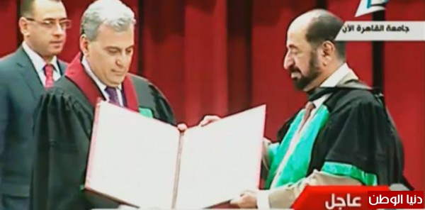 كما اعلن رئيس جامعة القاهرة الدكتور جابر نصار موافقة مجلس جامعة القاهرة بالاجماع على منح حاكم الشارقة سمو الشيخ سلطان بن محمد القاسمي الدكتوراه الفخرية في العلوم الاجتماعية ، لافتا الى ان الدكتوراه الفخرية تذهب الى حيث يكون تجسيد نظرية السلام والتعايش والحوار .