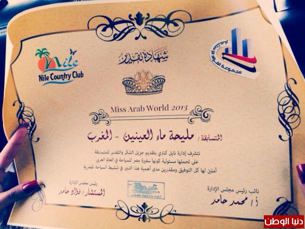 مليحة ماء العينين "20 عاما" ملكة جمال المغرب، طالبة بهندسة مدنية، تهوى ركوب الخيل والمشاركة في الأعمال الخيرية.