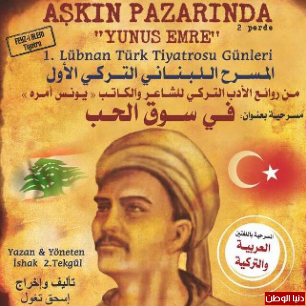 استضاف لبنان للمرة الأولى عرضاَ مسرحياَ تركياً جذب المئات الذين تعرفوا على الشاعر والكاتب التركي الشهير يونس أَمْرَه، كاتب قصة المسرحية التي حملت عنوان "في سوق العشق الإلهي". وأقيم العرض المسرحي على خشبة مسرح ثانوية روضة الفيحاء بدعوة من الجمعية اللبنانية التركية التي نظّمت الحدث تحت عنوان "أيام المسرح اللبناني التركي الأوّل" بدعم من وكالة التعاون والتنسيق (تيكا) التابعة لرئاسة الوزراء التركية وبالتعاون مع رابطة الشباب اللبناني التركي. وحضر على يومين متتاليين حوالي ألف شخص المسرحية التي أدّاها ممثلون أتراك باللغة التركية مع وجود ترجمة فورية إلى اللغة العربية على شاشة كبيرة. وأثرت المسرحية بمؤثراتها الصوتية والضوئية وأناشيدها وأغانيها الحيّة -على مدار ساعتين- في الجمهور الذي تفاعل معها ومع القصائد الصوفية والمواعظ الدينية التي كتبها يونس أمره.
