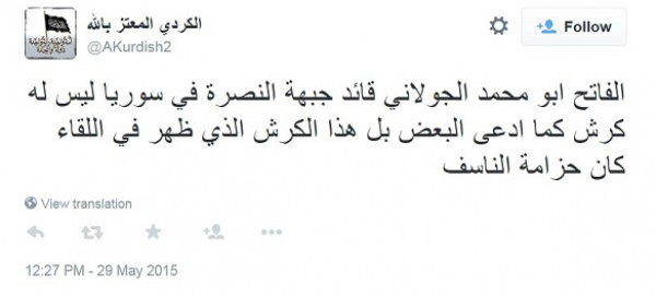 ومن جانبهم، أكد أنصار تنظيم جبهة النصرة ظهور "زعيمهم" مرتدياً حزاماً ناسفاً، متفاخرين بذلك.