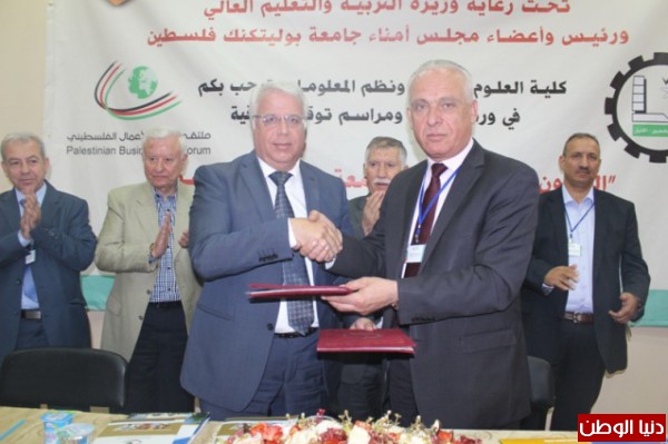 ووقع الاتفاقية كلاً من رئيس جامعة بوليتكنك فلسطين، ورئيس ملتقى رجال الأعمال، وفي نهاية الحفل تم عرض أهداف البرنامج وكيفية تنفيذها، وتم فتح باب النقاش وتوجيه الأسئلة والإجابة عليها من قبل المسؤولين