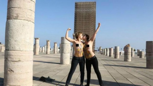 قامت ناشطتان من منظمة عاريات الصدر "فيمن" الثلاثاء، بنزع ملابسهما العلوية داخل صومعة مسجد "حسان" التاريخية في الرباط حيث يوجد ضريحي الملكين الراحلين محمد الخامس والحسن الثاني، وذلك احتجاجا على أوضاع المثليين في المغرب. تعرت ناشطتان من منظمة "فيمن" صباح اليوم الثلاثاء داخل صومعة مسجد "حسان" التاريخية في الرباط حيث يوجد ضريحي الملكين الراحلين محمد الخامس والحسن الثاني، احتجاجا على أوضاع المثليين في المغرب.