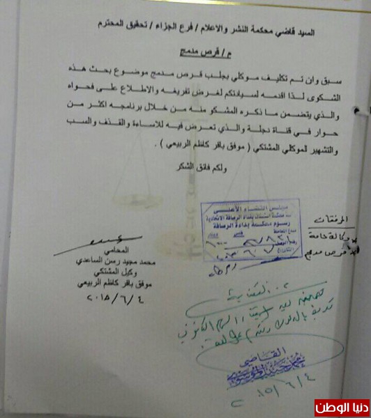 يواجه الزميل نبيل جاسم مدير قناة دجلة الفضائية خطر التصفية الجسدية على خلفية إتهامات سيقت مرتبطة بدعوى قضائية رفعها مستشار الأمن القومي السابق السيد موفق الربيعي ضده أمام محكمة النشر والإعلام بعد تعليقات تلفزيونية متعلقة بعمل السيد الربيعي في ملفات أمنية عندما كان مستشارا للأمن الوطني أدلى بها الزميل نبيل جاسم في برنامجه" أكثر من حوار" الذي يبث من قناة دجلة الفضائية وفي الحلقة التي عرضت في الأول من يونيو الجاري.