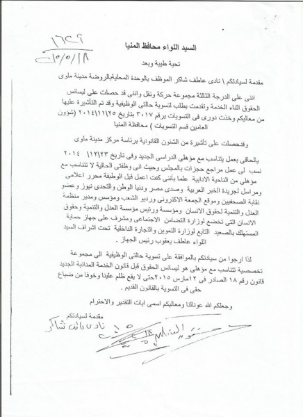 وتقدم نادي عاطف شاكر من العاملين ببرنامج التشغيل الحكومي عام 2002 بتظلم لمحافظ المنيا ومديرشئون العاملين ومسؤل قسم التسويات بالمحافظة لعدم مساواته بزملاءه العاملين بمحافظات المنيا والقليوبية والوادى الجديد بعد حصوله على مؤهل اعلى وهو ليسانس الحقوق لعام 2014 مما تسبب بحرمانه من كثير من المزايا الوظيفية والزيادة بالمرتب.
