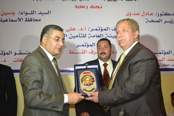 وفى ختام مراسم افتتاح المؤتمر تم تبادل الدروع والهدايا التذكارية بين رئيس هيئة التأمين الصحى ومحافظ الاسماعيلية .
