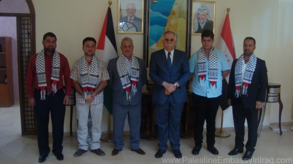 وتم اللقاء في سفارة دولة فلسطين العربية واستقبال الوفد من قبل السيد السفير الاستاذ احمد عقل سفير دولة فلسطين في العراق وكان استقبال كادر وموظفي السفارة والسكرتير الاول للسيد السفير والاستاذ فؤاد حجو المسؤول الاعلامي في السفارة ولقد تخلل اللقاء الكثير من المواضيع منها العلاقات المشتركة بين العراق وفلسطين تفضل السيد جميل المندلاوي في كلمته على اننا مع القضية الفلسطينية ومع الاسرى الموجودين في السجون الاسرائيلية وان مصيرنا واحد وعدونا واحد فلا بد من ان نوحد الصفوف لمواجهة العدوا والقضاء على كل من اعتدى والتاكيد على ان العراق باقي وموحد رغم الظروف والصعاب التي مر بها البلد
