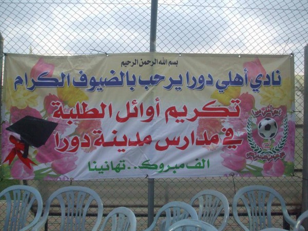 تحت رعاية بلدية دورا احتفل يوم أمس نادي أهلي دورا بتكريم الفوج الثامن عشر من الطلبة المتفوقين في مدارس مدينة دورا وبحضور رئيس بلدية دورا الدكتور سمير النمورة و مدير التربية والتعليم الأستاذ فوزي أبو هليل و عضو المجلس الثوري لحركة فتح زياد الرجوب وصاحب فكرة التكريم والداعم لها منذ انطلاقتها الدكتور محمد دودين وأبو محمد الغزاوي وإقليم حركة فتح ورؤساء المؤسسات الحكومية والخاصة والدكتور ناصر دودين مدير دائرة الأوقاف في جنوب الخليل والمربية الفاضلة فاطمة ابو كتة ممثلة القطاع النسوي ومدراء المدارس وأعضاء الهيئات التدريسية وعدد كبير من أولياء الطلبة المتفوقين انطلق حفل تكريم طلبة المدارس في مدينة دورا .