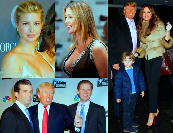 ترامب تمع زوجته ميلانيا وابنهما بارون، ومع ابنيه إريك ودونالد جونيور، وفي الأعلى ابنتاه تيفاني وايفانكا