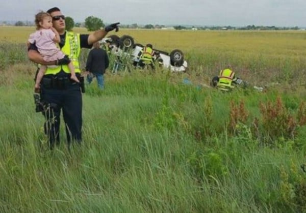 ووقع الحادث في كولورادو الأميركية بعد أن انفجر إطار سيارة العائلة وانقلبت وكانت الطفلة التي ظهرت في الصورة قد انتشلت أولاّ من دون خدوش وحملها أحد عناصر الشرطة وبدأ يحاول تشتيت نظرها عن الحادث.
