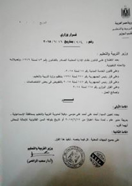 رسمياً: تجديد تعيين وكيل تعليم الإسماعيلية و ندبه وكيلاً لتعليم الأقصر