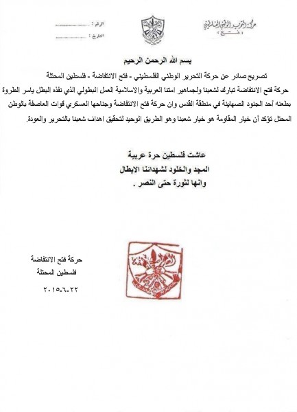 باركت حركة فتح الانتفاضة لشعبنا ولجماهير امتنا العربية والاسلامية العمل البطولي الذي نفذه البطل ياسر الطروة بطعنه احد الجنود "الصهاينة" في مدينة القدس.