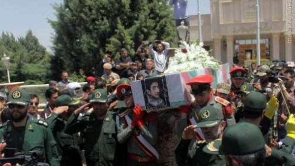 أقام الحرس الثوري الإيراني، اليوم الجمعة، مراسم جنازة عسكرية لأحد ضباطه برتبة ملازم أول، يدعى حامد جواني، والذي أصيب أثناء معارك اللاذقية في 13 مايو الماضي، وتوفي أمس الخميس، إثر تعفن جروحه البليغة، وذلك بعدما كان في غيبوبة لمدة 40 يوما بمستشفى في طهران.