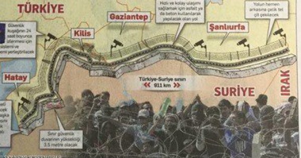 قالت صحيفة "ملييت" تركية، السبت، إن حكومة رجب طيب أردوغان رئيس الوزراء، تعتزم بناء جدار أسمنتى بطول الحدود مع سوريا، بهدف منع عمليات التهريب وتسلل المسلحين، ومن المقرر أن يبلغ ارتفاع الجدار 3.5 متر، وسيتم شق طريق مواز له داخل الأراضى التركية.