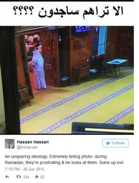 أشارت الصحيفة إلى تغريدة على حساب باحث شرق أوسطى، يدعى حسن حسن، قائلاً إنها لخصت الفعل الوحشى للهجوم، مفادها "ألا تراهم ساجدون؟ّ!!".