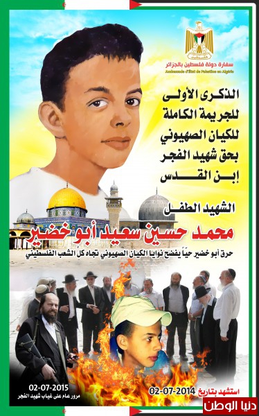 أصدرت سفارة دولة فلسطين لدى الجزائر بوستر خاص فى الذكرى السنوية الأولى لاستشهاد إبن القدس الطفل خضر حسين سعيد أبو خضير –بريشة الفنان الفلسطينى أيمن عيسى .