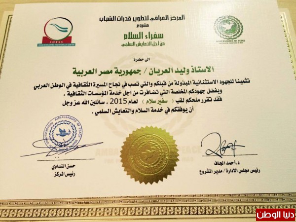 المركز العراقي للتطوير قدرات الشباب يمنح الصحفى المصري وليد العريان لقب سفير السلام لعام 2015
