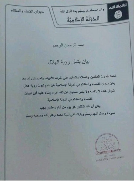 وقال البيان إن ديوان القضاء والمظالم في الدولة الإسلامية أعلن عدم ثبوت رؤية هلال شوال عنده لا بنفسه ولا بخبر صحيح عن ثقة غيره، وبناء عليه فإن ديوان القضاء والمظالم في الدولة الإسلامية يعلن أن غدا الإثنين هو يوم من أيام رمضان يجب صومه حسب زعمهم.