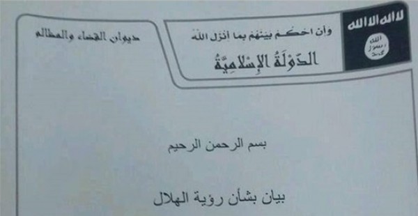 أصدر ما يسمي بتنظيم الدولة الإسلامية في العراق والشام "داعش" بيانا زعم فيه إن غدا الإثنين هو المتمم لشهر رمضان وعلي المسلمين في جميع أنحاء العالم الالتزام بذلك.
