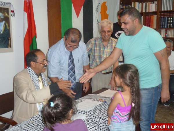 تحت اشراف سفير سلطنة عمان الشيخ أحمد الشنفري وسفير دولة فلسطين د. وليد حسن وبمناسبة حلول شهر رمضان المبارك جرى اليوم في مقر سفارة دولة فلسطين في العاصمة القبرصية نيقوسيا توزيع المعونة العمانية المقدمة من الهيئة العمانية للأعمال الخيرية على اللاجئين الفلسطينيين الفارين من هول الحرب الطاحنة في سوريا والذين تم أنفاذهم قبالة السواحل القبرصية في شهر سبتمبر 2014 .