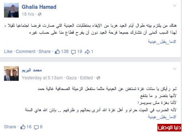 ووجدت المبادرة صدى واسع خاصة من "الشباب" فكتب أحدهم :"النسوان في غزة يجب ان يطلقوا مبادرة ما بقبل عيدية احتراما لواقعنا المر.. ولنتخلص من هذه العادة المرهقة ...!!".