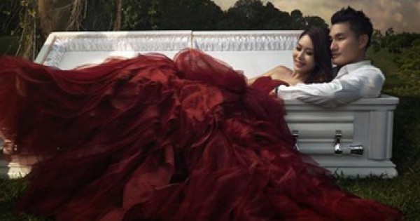 "الموت هو فى الواقع جزء من الحياة.. ولا يجب أن نعيش الحياة ونحن خائفون من الموت" بهذا المنطق قرر العروسان "جينى تاى" (29 عامًا) و"دارين تشنغ" (30 عامًا) أن تبدأ حياتهما الجديدة معًا من الموت، ليجسدا المعنى الحقيقى لتعهد الزواج "سنظل معًا حتى يفرقنا الموت" فقررا أن تكون جلسة التصوير الخاصة بزفافهما إلى جانب تابوت.