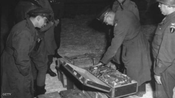 وعثر أيضا مع العملات على ختمين من الألمونيوم، عليهما صليب معقوف ونسور، وعبارة "رايخ بنك برلين 244".
