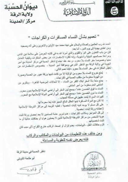 وكان التنظيم قد أصدر في وقت سابق منشورا وضع فيه شروطا صارمة لخروج المرأة من بيتها بمحافظة الرقة السورية، حيث حظر عليهن الخروج لما يسميها "بلاد الكفر" إلا للحالات المرضية.